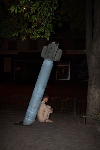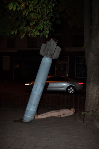 Перформанс складається з трьох частин – це стани свідомості, які переживає людина під час війни. В першій частині я лежу під снарядом і знаходжусь у стані жертви. Ти бачиш загрозу і не можеш нічого вдіяти з цим. Це стан безвиході і заціпеніння. Страх, який паралізує. В другій частині снаряд спирається на мої плечі. Загроза перетворюється на тягар. І в такій ситуації завжди є ті, хто його несуть. Відповідальність за війну лягає на плечі невинних. Третя частина – стан поза війною. Я спираюсь на снаряд, і він втрачає свою первісну функцію, стає опорою. Я довіряю і страх зникає.