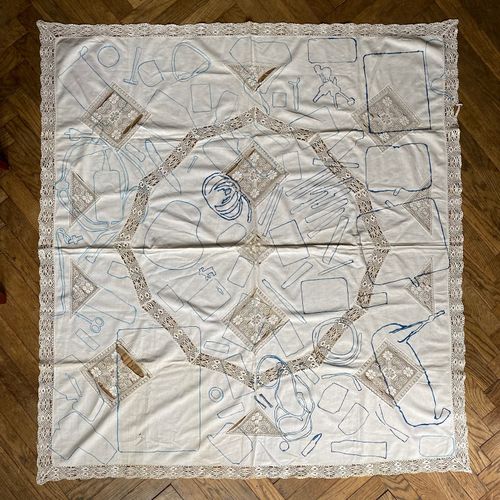 «коли почалась війна, я була не вдома у Києві і допрацьовувала музей П. Горицвіт у Криворівні до відкриття 1 березня. музей ми не відкрили і я поїхала до Львова на квартиру друзів друзів, іноді там з'являлись знайомі минулої орендарки квартири, забирали якісь речі. в якості може помочі переміщеній особі мені подарували скатертину. вона була стара, з жовтими слідами, з ручною вишивкою, була мені абсолютно не потрібна. скатертина викликала щем й асоціювалась з блокадою і голодом. цей вечір був самим важким: я знаходилась у чужій квартирі у безпеці і нікого не могла врятувати. з минулого зі мною залишився лише мій рюкзак із речима, який не збирався як тривожний. через якийсь час я виклала на скатертину всі предмети, з якими я переживаю війну. тривожна скатертина».