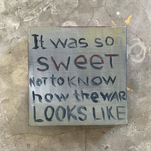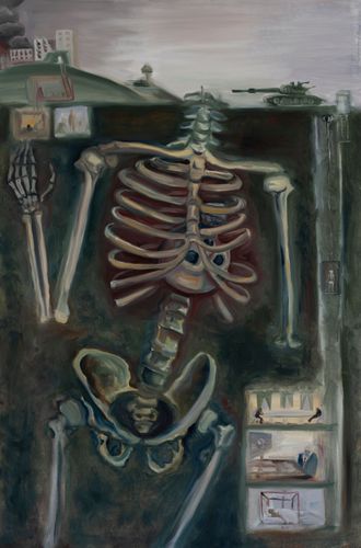 Проєкт розпочався в Берліні, де за чотири місяці до початку повномасштабної війни я створила першу картину. На ній зображена фігура з “кравчучкою”, яка чи то в музеї, чи то в супермаркеті обирає черепи. Мені важко пояснити собі, чому цей образ виринув у мене. Можливо, це сталося під впливом новин, що постійно з’являлися на той час та посилювали тривогу, або через несвідоме передчуття страшного всередині, але робота стала пророчою. Перші тижні війни я знаходилася в Києві, після чого була вимушена поїхати з України до Іспанії, де резиденція CeRCCa надала мені притулок. Протягом перших двох місяців я не могла працювати через неможливість збагнути та прийняти, що у моїй країні триває повномасштабна війна. Сама думка про можливість війни була неосяжною, а колективний біль — занадто глибоким. Виходячи з цієї неосяжності, розпочався проєкт “Розтин”. Роботи з цього проєкту намагаються проявити досвід, який я та інші українці та українки зараз переживають, і розібрати цей невимовний, всеохоплюючий біль на більш дрібні частини. Сподіваюсь, що в такий спосіб він стане більш прийнятним для усвідомлення.