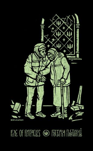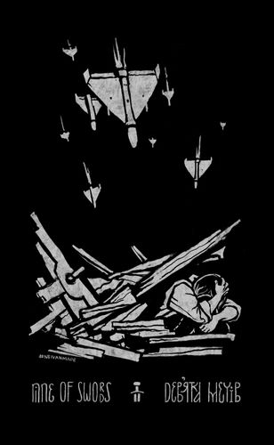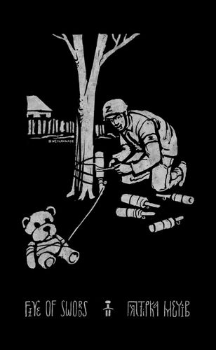 Чи можливо зберегти пам’ять про немислиме, про те, що не можна вмістити у прості слова? З початком повномасштабного вторгнення росії я зображаю події нашої боротьби у воєнних плакатах. Усвідомлення того, що за обличчями людей, які потрапляють у ЗМІ, ховається безліч інших подвигів і трагедій, змусило мене зводити реальні постаті до спільних образів, архетипів. Тому я застосовую виражальні засоби народних дереворитів, традиційного іконопису та циклу Франсиско Гойї “Жахи війни”, адже тут вся увага не стільки на “фотографічному” відтворенні реальності, а на прихованій символічній суті. Прагнення відобразити реалії війни у цілісному циклі привело мене до традиції Таро. Я розглядаю карти Таро не як намагання передбачити майбутнє, а лише як спосіб відобразити реальність в упорядкованій символічній структурі із 78 образів. Тому проєкт є результатом поєднання реальних образів війни та класичної іконографії Таро Райдера-Вейта 1910 р. у виконанні Памели Сміт. Ним я прагну розширити фокус сприйняття сучасних подій, розглядаючи їх крізь призму багатовікової символьної традиції.