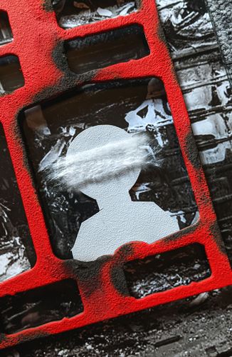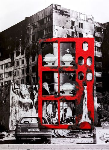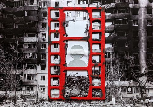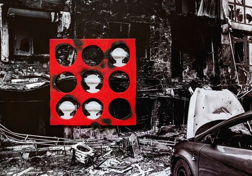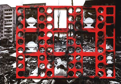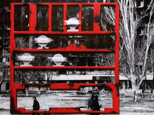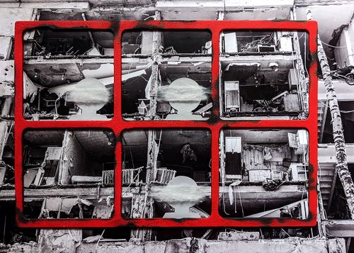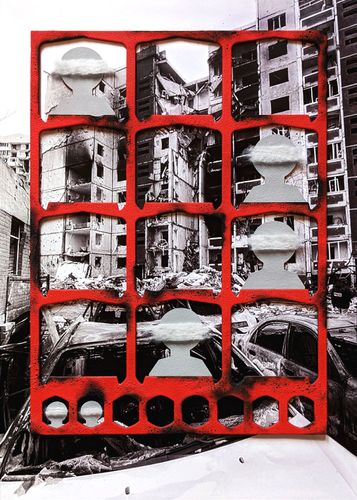 Серія #55 була створена на 55-ий день повномасштабної війни. Це колажі зі скла та фотографій українських міст, що зазнали руйнувань, та імітації будинків з обпаленого картону. Персонажі на них ледь видимі, вони постають як привиди. Ця серія — моє проживання болю за тих, хто залишився без домівки, без близьких. І за тих, хто не залишився з нами взагалі. Ці роботи присвячені всім, чиї історії обірвалися. Вони про зруйновані життя. Про страх. Про те, як боляче, коли згасають очі.