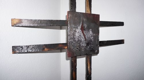 Щоденник доповнює дерев’яна інсталяція, пов'язана з переосмисленням спогадів, що асоціюються з домом. Моє дитинство пройшло в старій хаті-мазанці у місті Васильків. На початку повномасштабного вторгнення почалося бомбардування нашого містечка, підірвали аеродром, нафтобазу і декілька будинків, ворожий десант висаджувався на сусідніх городах. Ми боялися, що нашого будинку, який розповідає історію 4 поколінь однієї родини, вже немає. Що у нас вкрали спогади, спаливши і знищивши їх. Особливий символічний зміст у традиційних українських хатах має кут, в якому розміщувались ікони та сакральні образи. Коли в дитинстві я не могла спати, бабуся завжди казала, що сон ховається в кутку. Я переосмислюю ідею кута, розміщуючи всередину старі обвуглені дошки, намагаючись зберегти частину власної історії.