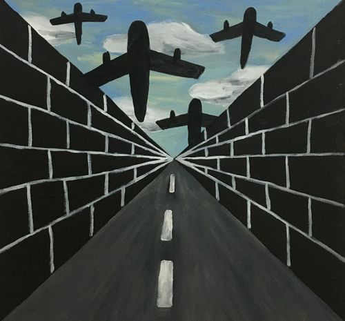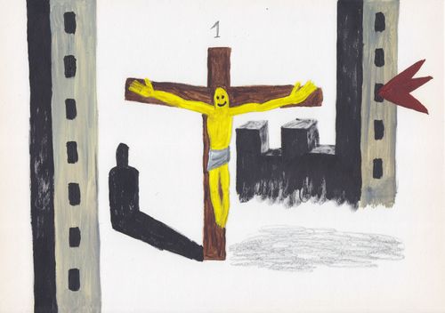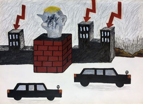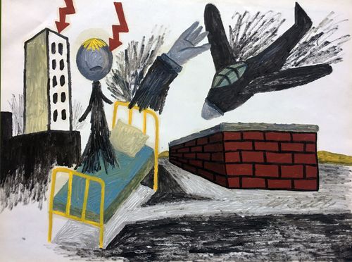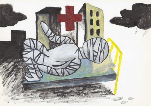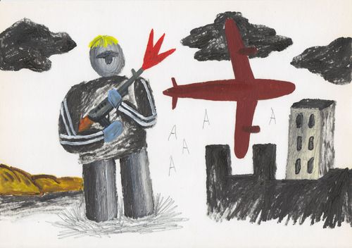 Про війну я дізнався вночі. Подруга, яка мала того дня принести мені суп до майстерні, зателефонувала і повідомила, що почалася війна. Сказала, що потрібно ввімкнути новини, і кинула трубку, бо сама поспіхом збирала речі для евакуації. Весь цей жах за два тижні перетворився на рутину, до страшних сирен і вибухів я вже звик. Їжаки та блокпости встигли стати начебто звичайною частиною міського пейзажу. Тож свідомість розглядає це як буденне життя, а через такий стан робиться тільки гірше. Першого дня я відразу пішов до майстерні, ввімкнув дезкор і почав малювати те, що сталося за ці кілька годин. Здається, не так і довго, але вистачить, на жаль, ще на чимало картин.